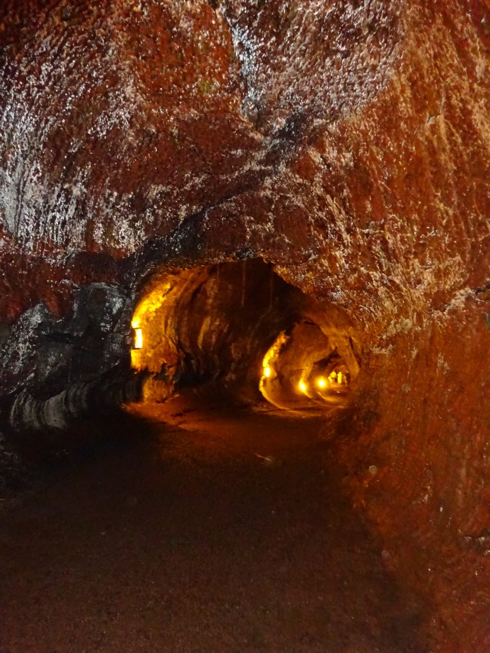チェーンオブクレーター道路を南下してサーストンラバチューブへ。溶岩流の外側は外気に触れて冷え固まり、内側の熱いドロドロの溶岩はそのまま流れ出てしまい溶岩トンネルが出来たそうです。入口の展望スポットからオヒアやシダなどで覆われた密林が現れます。トンネルは思ったより短いものでしたが、溶岩で出来ているなんて凄いです。絶滅が危ぶまれているハワイ固有種のミツスイ(鳥)、アパパネも見ることができました。真っ赤なんですよ。ただ動きが速いので、なかなか写真には撮れませんでした。