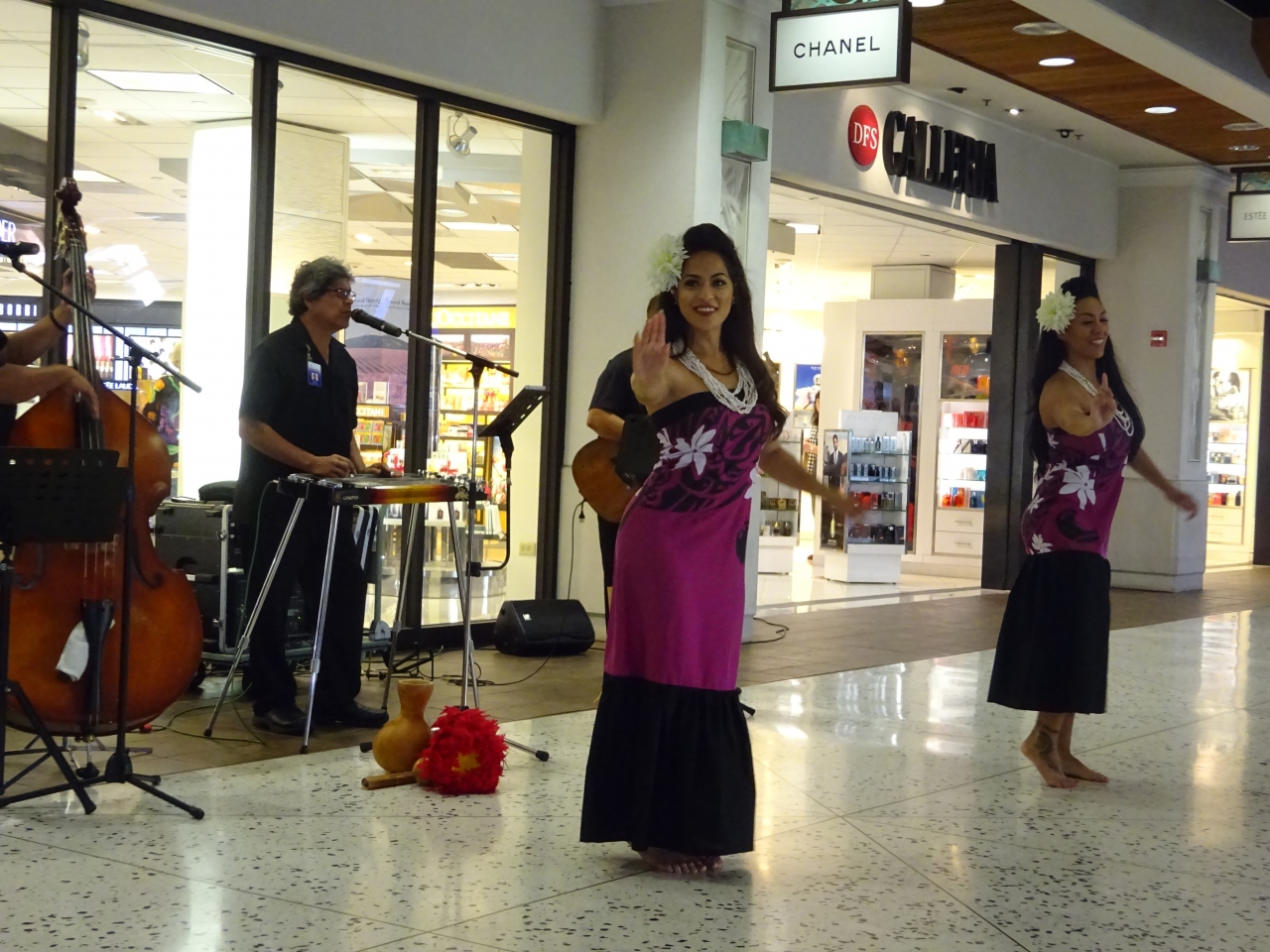 ワイキキからタクシーで30分くらい。空港で待っている間、ロビーでハワイアンショーをやっていました。丁度座っていた席のまん前で踊ってくれたので、いい時間を過ごせました。最後までありがとうという感じでした。