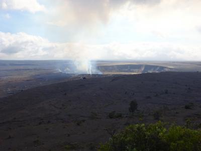 国立公園のゲートに到着。$15払って入ります。ビジターセンターを通過してリムドライブを走ってジャガー博物館へ向かっていると、煙の出ているスティームベントがありました。地面に含まれる雨水が地下の熱い岩で熱せられて水蒸気となって出てきています。ジャガー博物館の展望台から一望できるキラウエア・カルデラ(キラウエア火口)とハレマウマウ火口の壮大な景色は素晴らしいです!2010年からジャガーミュージアムから先の道路が閉鎖されているため、ハレマウマウ火口の噴煙を見るならここが一番近いスポットとなっています。