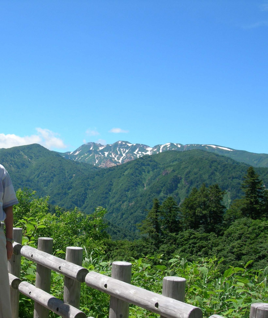 白山展望台から白山の主峰三山が見渡せます。剣が峰、御前が峰、大汝峰です。雪の残った山々はいいですね。特に夏は清涼感があってほっとします。ここに至るまでにたくさんの滝を見ることが出来ましたが、山がやはり最高です。