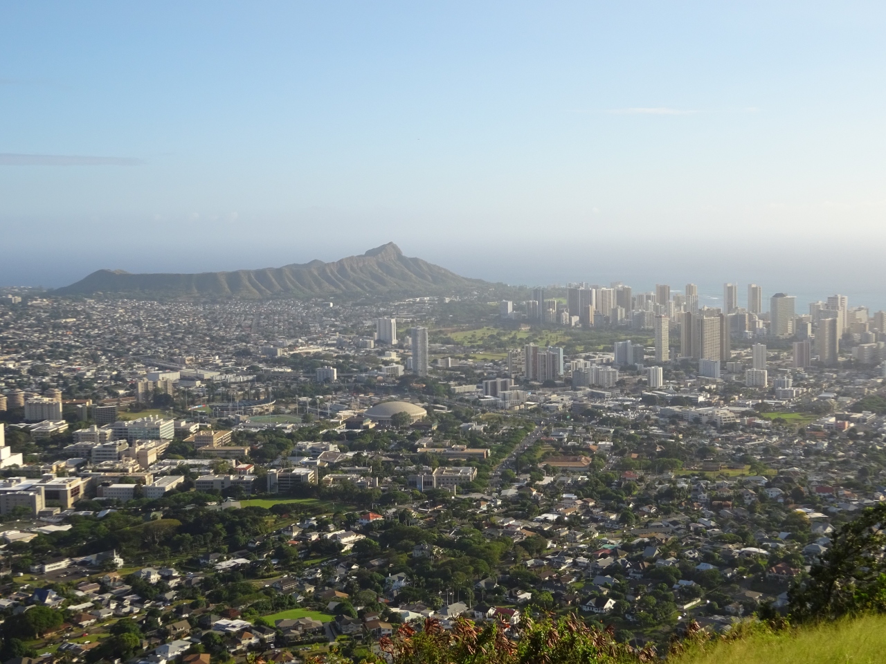 ホノルルの北にせり出したコオラウ山脈の山裾に、火山の噴火で隆起した「天然のテラス」がこの丘なのです。小高い丘の上に立つと、ダウンタウンに林立する高層ビルからダイヤモンドヘッド、その向こうに広がる真っ青な海までが一望のもとに見えます。きれいです。