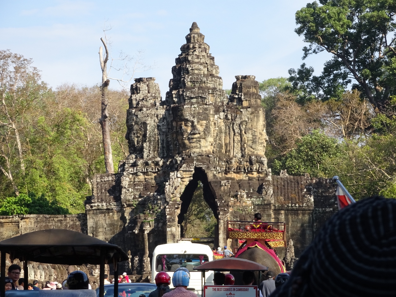 アンコール・トムの中央に位置するバイヨン。まずは南大門から入りますが、南大門には観世音菩薩の四面塔があります。またその道の両脇には神と阿修羅がナーガの胴体を引き合う像108体が並んでいます。内部にはレリーフが描かれ、みごとです。