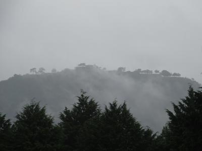 あいにくの雨降りで見えないかなと思いつつ、立雲峡のビュースポットへ行きましたが、少しの間だけ、霧の中に城跡が見えました。ぼんやり霞んだ城跡は幻想的。本当に山の上を平らにして建てたような不思議な空間でした。