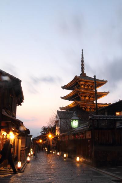 夕方の暮れなずむ空の下にたたずむ塔を高台寺の駐車場からのぞむ……これもいいですヨ。- 旅行時期