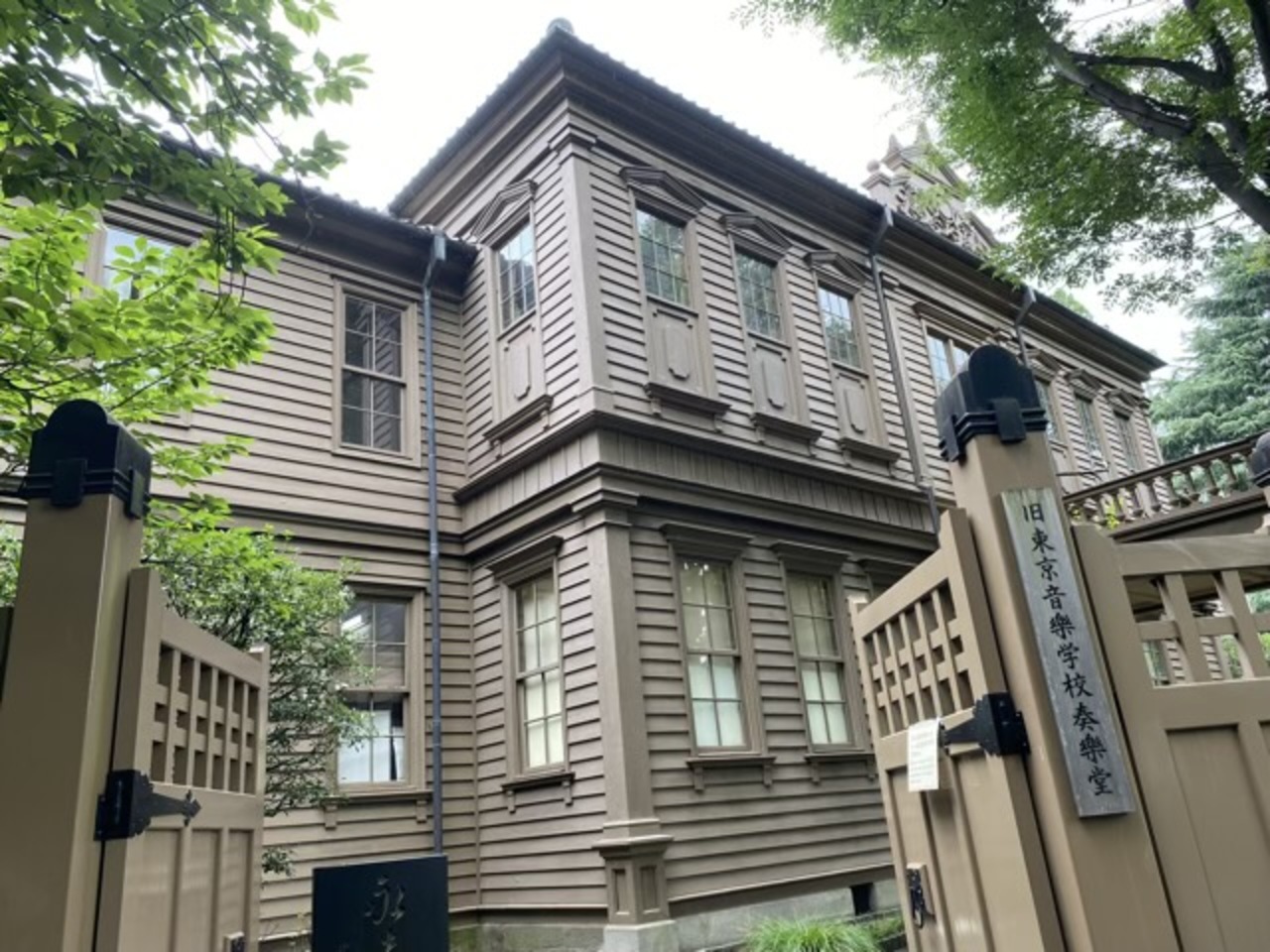 上野恩賜公園を北西の角から出た辺りにありました。建物を正面から見ると入口のあるブロックを挟んで両側にブロックがあって広がりを感じます。明治時代に建てられた東京藝術大学音楽学部の前身だそうで重要文化財なのも納得です。