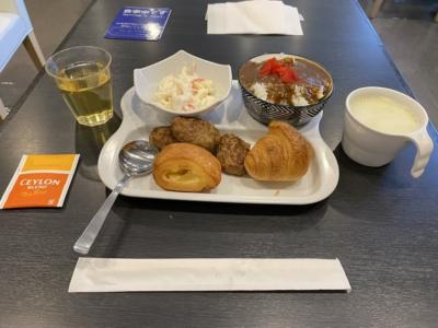無料朝食が付いていたのであまり期待せずに行ってみると品数はそんなに多くないものの、パン、小さいハンバーグ、マカロニサラダ、スープそしてカレーがあって朝からお腹いっぱいになりました。結構慣れた感じのサラリーマンもて朝食は人気があるようですね。