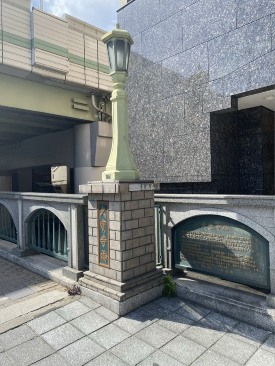 東横堀川に架かる農人橋の一つ南の橋です。近くに久宝寺というお寺があったことが由来のようですが現在はそのお寺は無いそうです。親柱の街灯や欄干のアーチ状の意匠がなかなか雰囲気があるのですが、いかんせん高速道路が上に被さっているため全体的には風情が台無しですね。