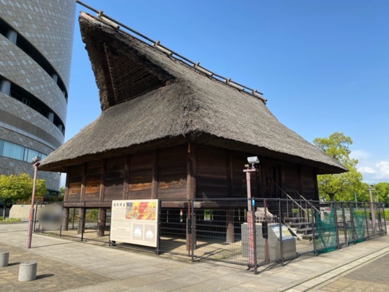 大阪歴史博物館の麓にポツンと一棟あります。屋根の形が目を引きますが下に目を向ければ多数の柱の上に建っている、いわゆる高床式倉庫というやつですね。古墳時代のものなのでお隣の難波宮より古く、よく考えたらこのエリアでは大阪城も含めて3つの時代の建物を見ることができるのですね。