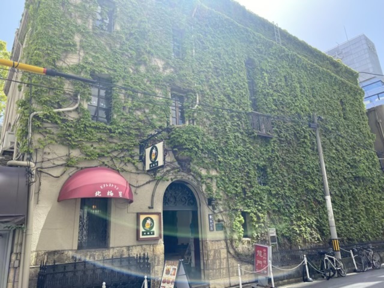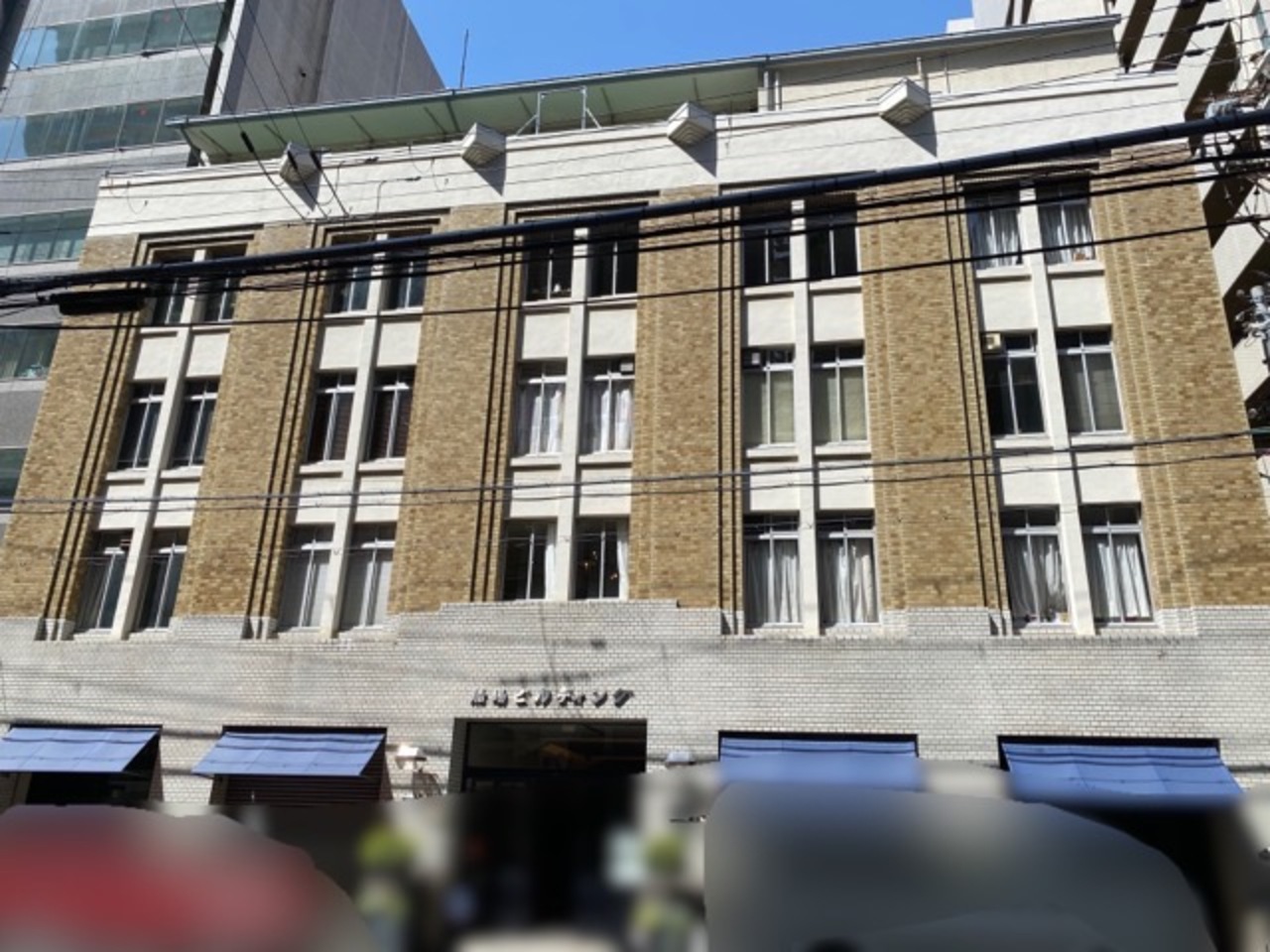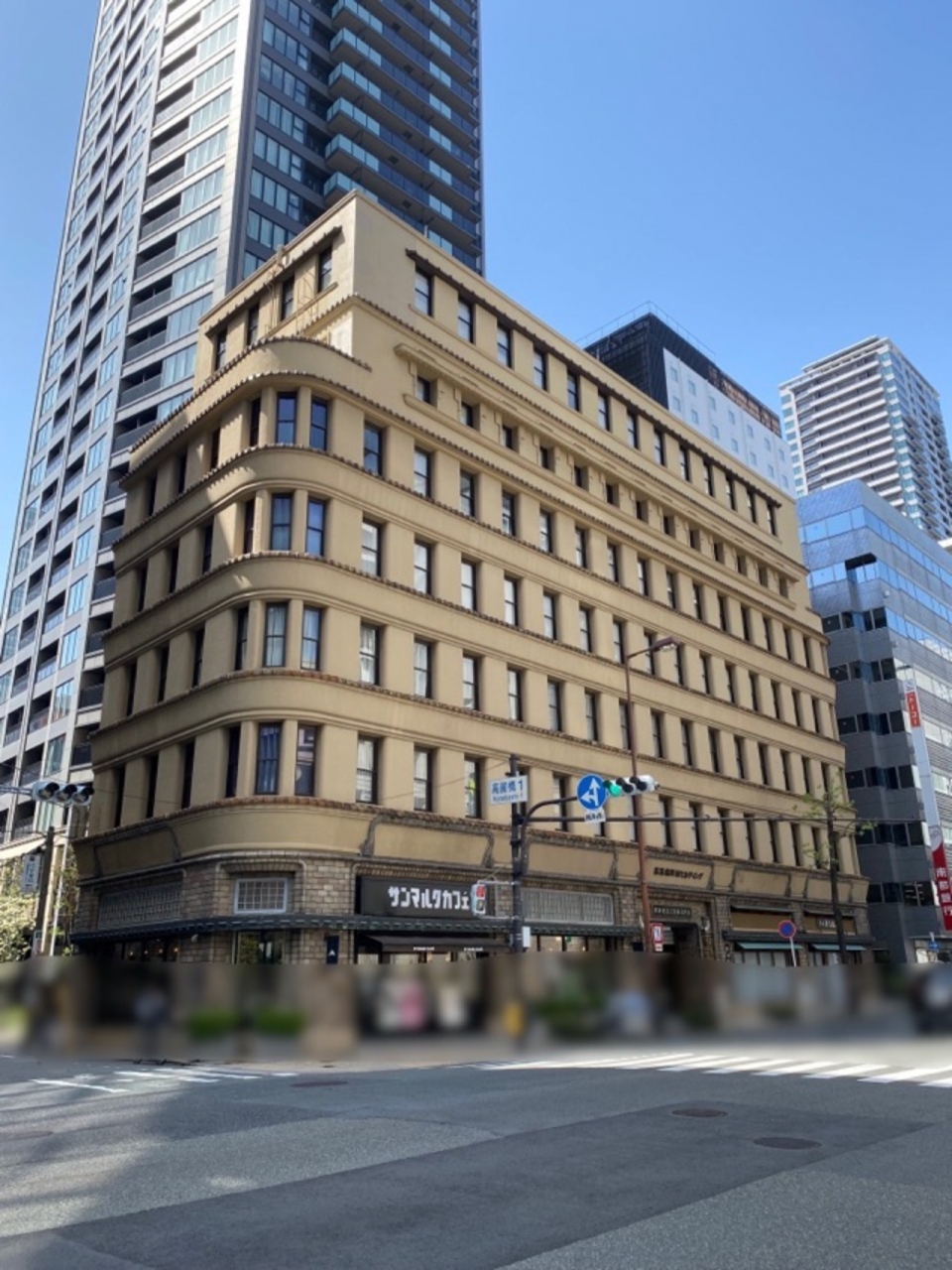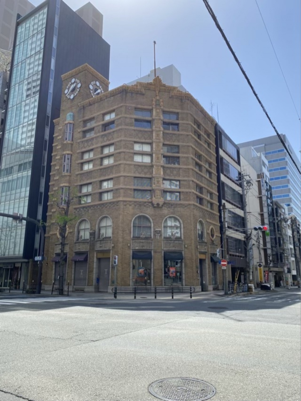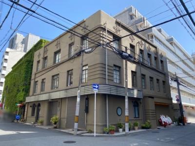 旧小西家住宅から堺筋を少し北に歩いた向かい側にあります。この辺りのレトロ建築は角が丸いのが多いですが当時の流行りでしょうか。上階だけ少し面積が削られているのがアクセントになっていますね。黄土色みたいな色は周囲の風景の中でかなり目立っていました。