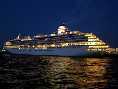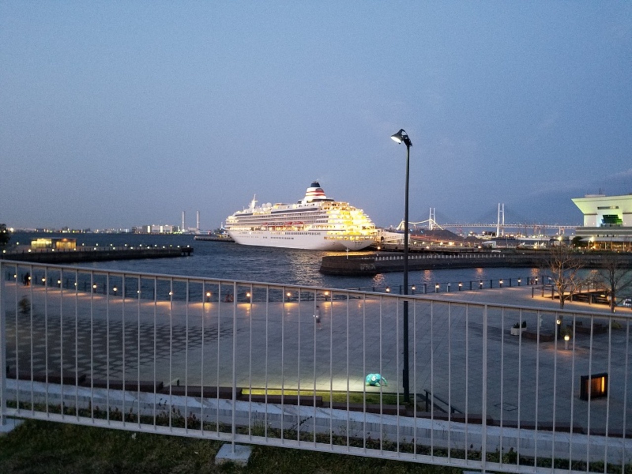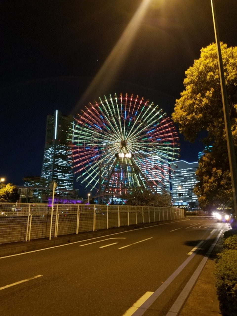 コスモクロック21は夜になるとイルミネーションされます。日本丸の辺りからも見えますが遠い感じなので近くまで行ってみると大迫力の光景でした。様々に色が変わるだけでなく一体どうやっているのかと思うような動きのある模様が映し出されるので飽きることなく見入ってしまいました。