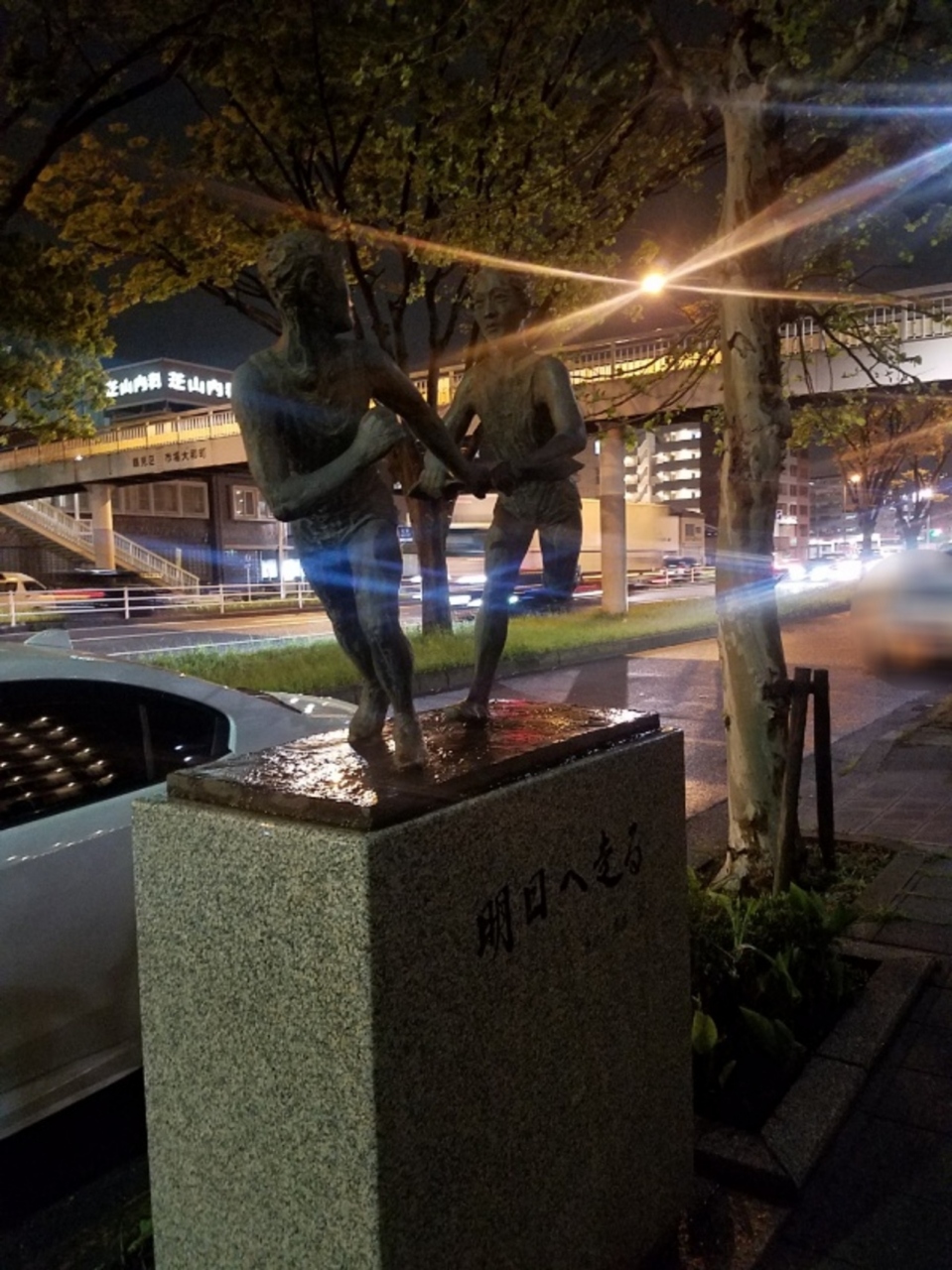 京急の鶴見市場駅の近く、「市場交番前」交差点の辺りです。鶴見駅伝の往路にあたる横浜方面の道路側に渡ると、たすきを渡している瞬間の二人のランナーの銅像がありました。駅伝ならではのポーズなのでなかなか見ない像ですね。大手町にはゴールテープを切っている像があったので機会があれば箱根にあるという銅像も見てみたいです。