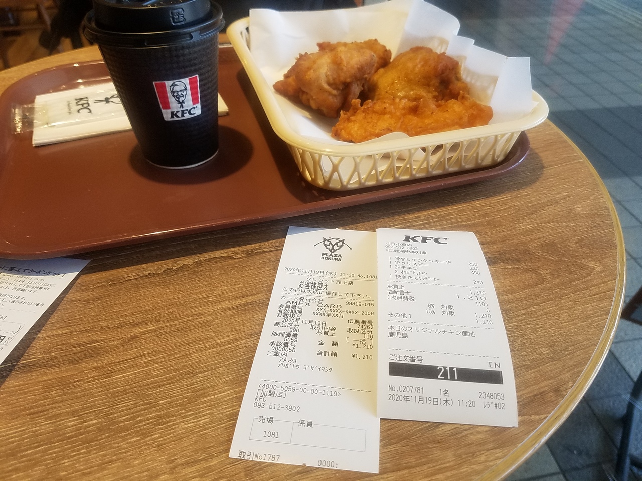 山陽新幹線でお昼前に小倉に着いたのでランチに利用しました。ケンタッキーが目についたので久しぶりにオリジナルチキンとクリスピーと骨無しチキンの食べ比べをしました。オリジナルチキンは食べにくいですがやはり好きな味ですね。席はミスドと共用のようでした。