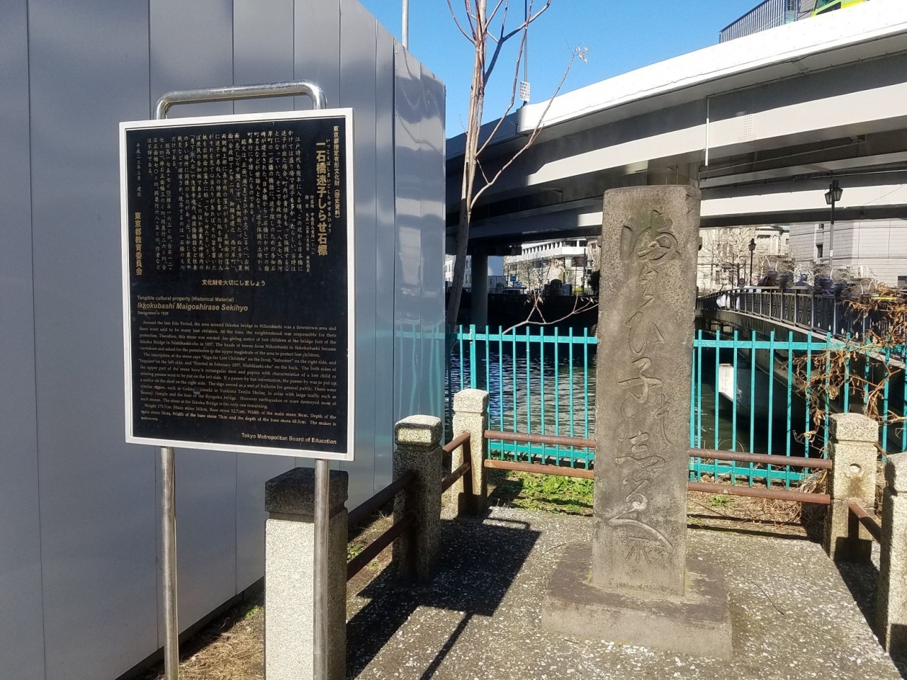 一石橋の4つの親柱のうち南西の一つが大正時代のものですが、その横にありました。江戸時代後半にはこの辺りは盛り場で迷子も多く、この石碑に迷子の特徴を書いた紙や、心当たりのある人はその情報を書いた紙を貼って、迷子の告知板として使われていたそうです。このような石碑の使われ方は初めて知りましたがなかなか面白い発想ですね。