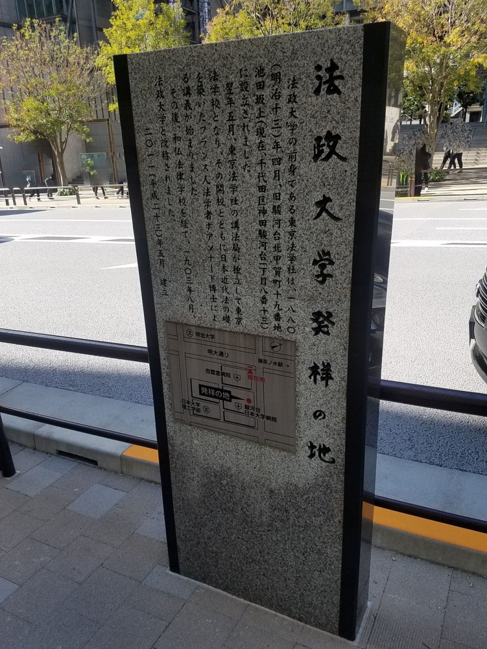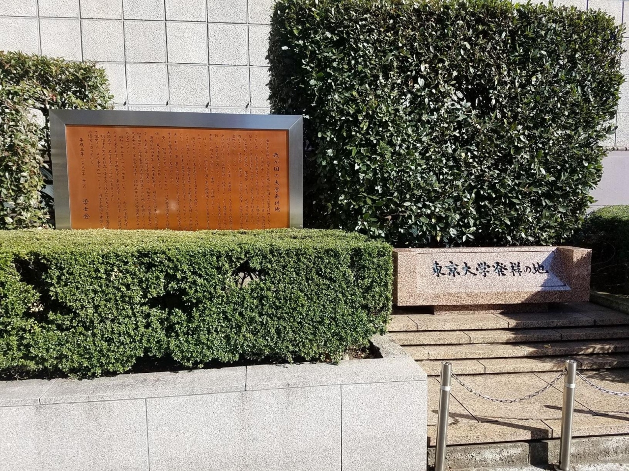 学士会館の敷地の南西の角にあります。1877年に東京開成学校と東京医学校が合併してこの地に東京大学が設立されました。これが日本最初の官立大学でもあることを示した碑です。東大は本郷に移転する前はここにあったのですね。この地が学士会館になっているのも納得の歴史を発見できました。
