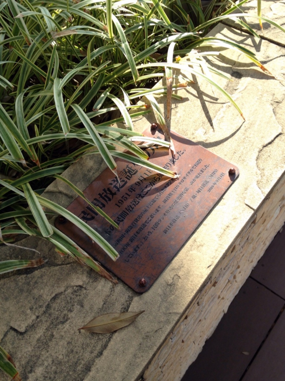 阪急うめだ本店の屋上広場の植え込みにありました。屋上北側のヨドバシカメラ方面などを眺められる一画です。1951年9月1日に民間ラジオ放送が始まったことを記念したものです。小さな銅板なので最初はしょぼいなと思ったのですが、阪急百貨店の屋上のスタジオから放送したとあり、アンテナを高い場所に設けるためだと知ってなるほどなと合点がいきました。