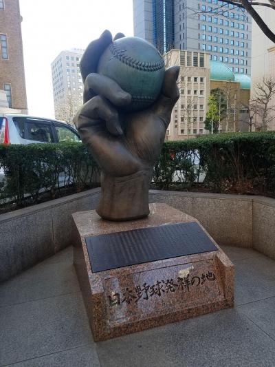 学士会館の敷地の北側の端にあります。教師として来日したホーレス・ウィルソン氏が授業の傍らに野球を日本に初めて伝えたことを記念したもので、1800年代のことなので学士会館ができる前ですね。碑は人より高さがあるので写実的な手の造形は結構インパクトがあります。