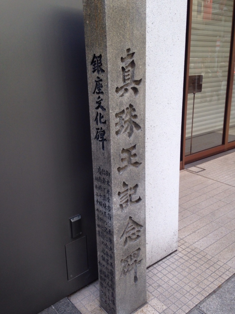 中央通りを歩いたいたらありました。銀座にしては随分簡素な石碑だし王なんて記述は珍しいなと思って側面の字を少し読んでみると御木本幸吉翁うんぬんとあり何と読むのか暫し考えた後に閃きました。
