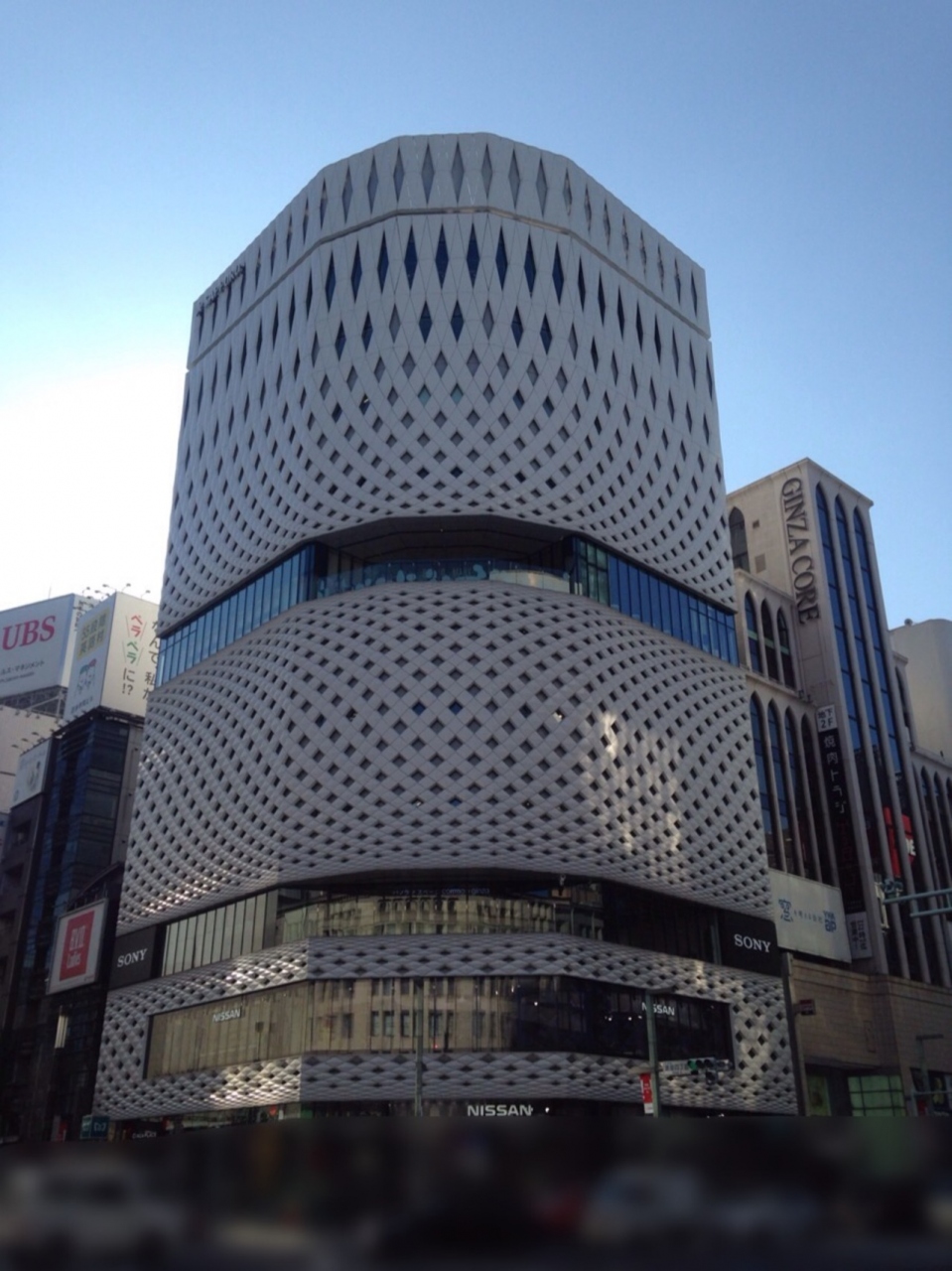 銀座四丁目交差点に面してあります。対角にある老舗の和光と対になるように近代的なデザインのビルですね。歩行者目線の1階にある日産のショールームが目立ちますが上の階にはソニーのショールームが入っていたり地下にはレストランがあったりと多彩な店舗構成でした。