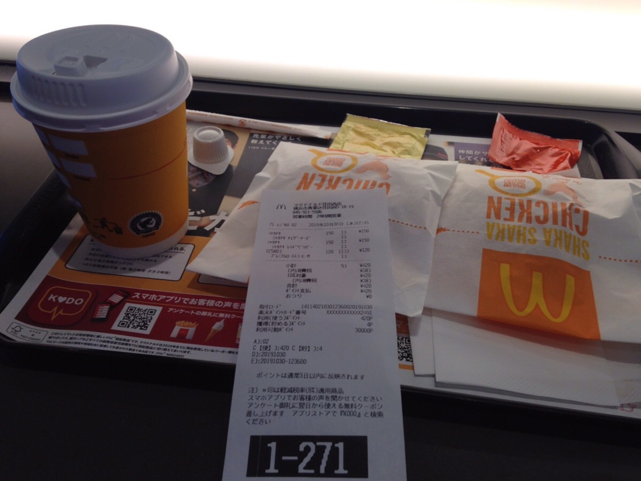 何度か利用していますがポテトは高確率でカウンターでは渡されずに揚げたてを席まで持ってきてくれることが多かったです。そんな印象があったのでクーポンもあったこともありポテトのLを注文してアツアツのものを頂きました。お腹の空き具合によってはハンバーガーなどの主食類がなくても十分満足できますね。