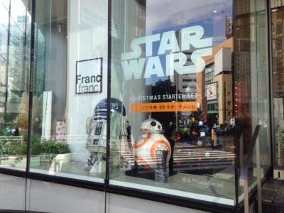 青山通りと外苑西通りの交差点で信号待ちをしていて何気なく見るとBB-8が目に入りました。R2-D2も居てさてはスターウォーズとコラボだなと思いましたがやはりこの日からスター・ウォーズクリスマスツリーが販売開始でした。ツリーにスターウォーズキャラの顔がたくさんぶら下がっていて賑やかそうでした。