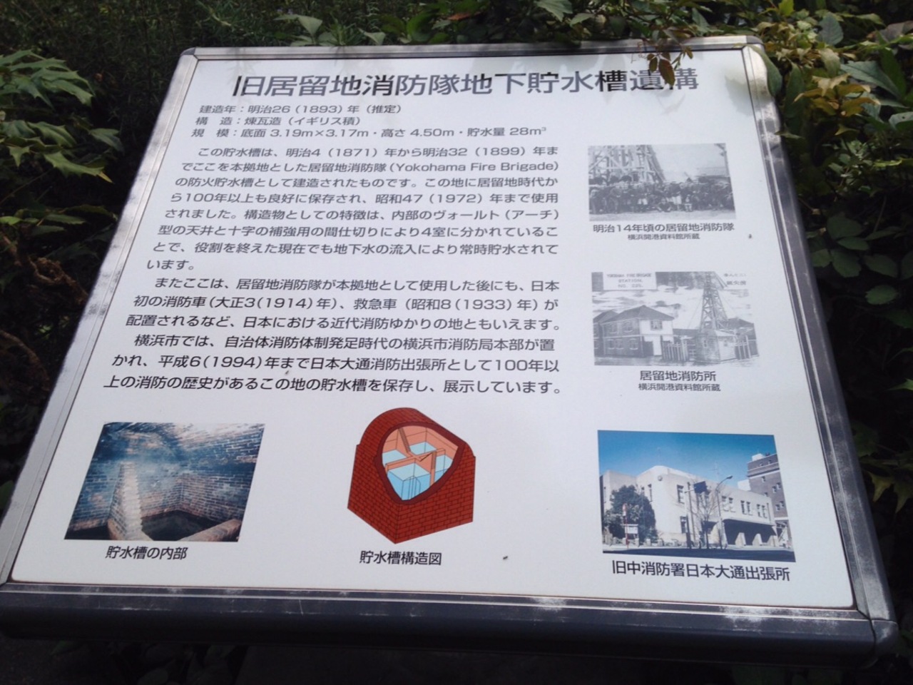 大桟橋通り沿い、かをりの向かい辺りにあります。何やら瓦礫の中に煉瓦造りのアーチが見えていましたがこれは天井部分で、地下に貯水槽があるようです。1972年まで使われていたこの貯水槽は壊れておらず現在も雨が降れば水が溜まるのだとか。説明板を読まないと何が何だか分からないので時間を取ってまず読んでみてください。