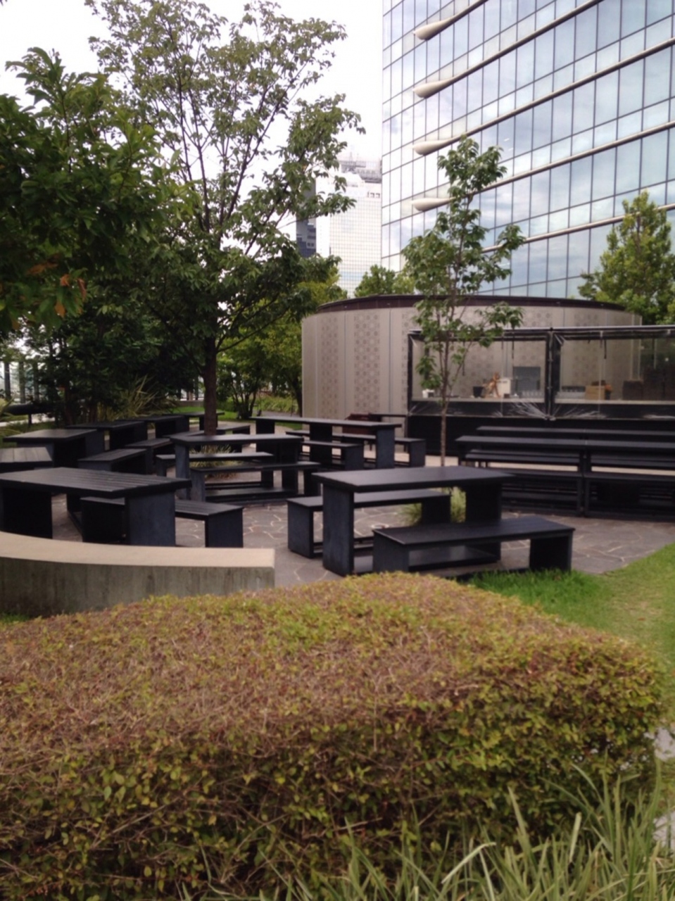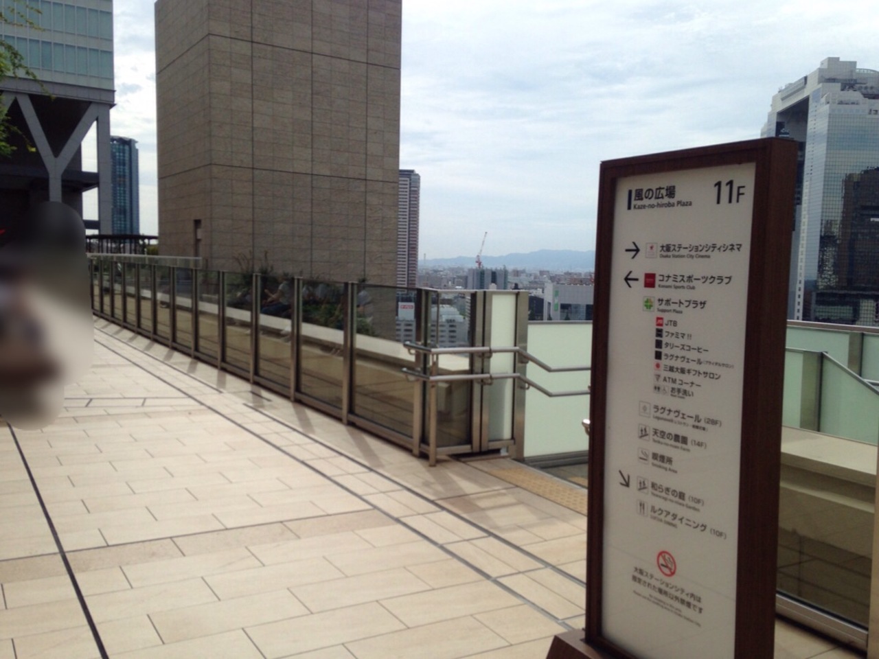 ノースゲートビルディングの11階にあります。芝生やウッドデッキもある開放感のある広場で、外国人を含めて夏の日差しを楽しんでいる人が沢山いました。傍らには日本庭園風の一画もあったり、周りはそれ程密集していない新しいビル群が見えるので買い物途中の良い気分転換になると思います。