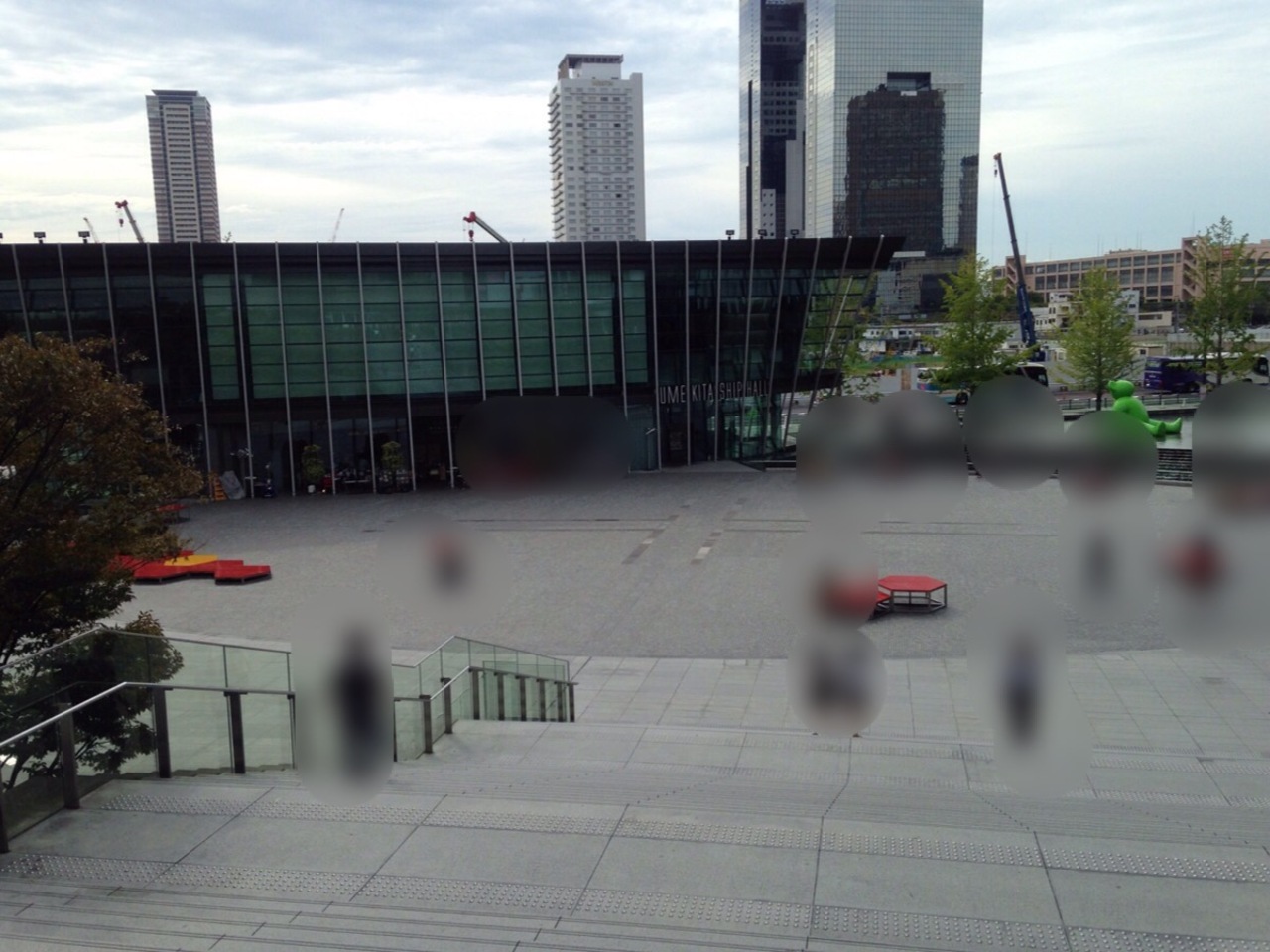 アトリウム広場から見下ろす形であります。グランフロントの脇下ですね。大阪駅の駅前とは思えないぐらい贅沢に平坦な広場でカラフルなベンチやモニュメントもあってただ佇むだけで得した気分になります。地下階にはカフェやレストランがぎっしり詰まっているのでお腹が空いたらそちらに移動しましょう。