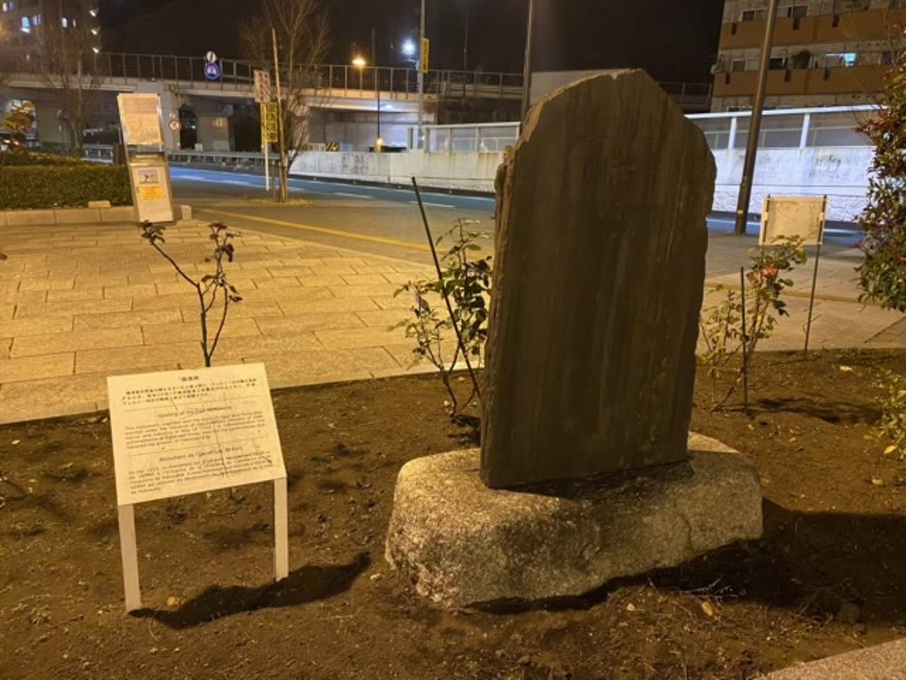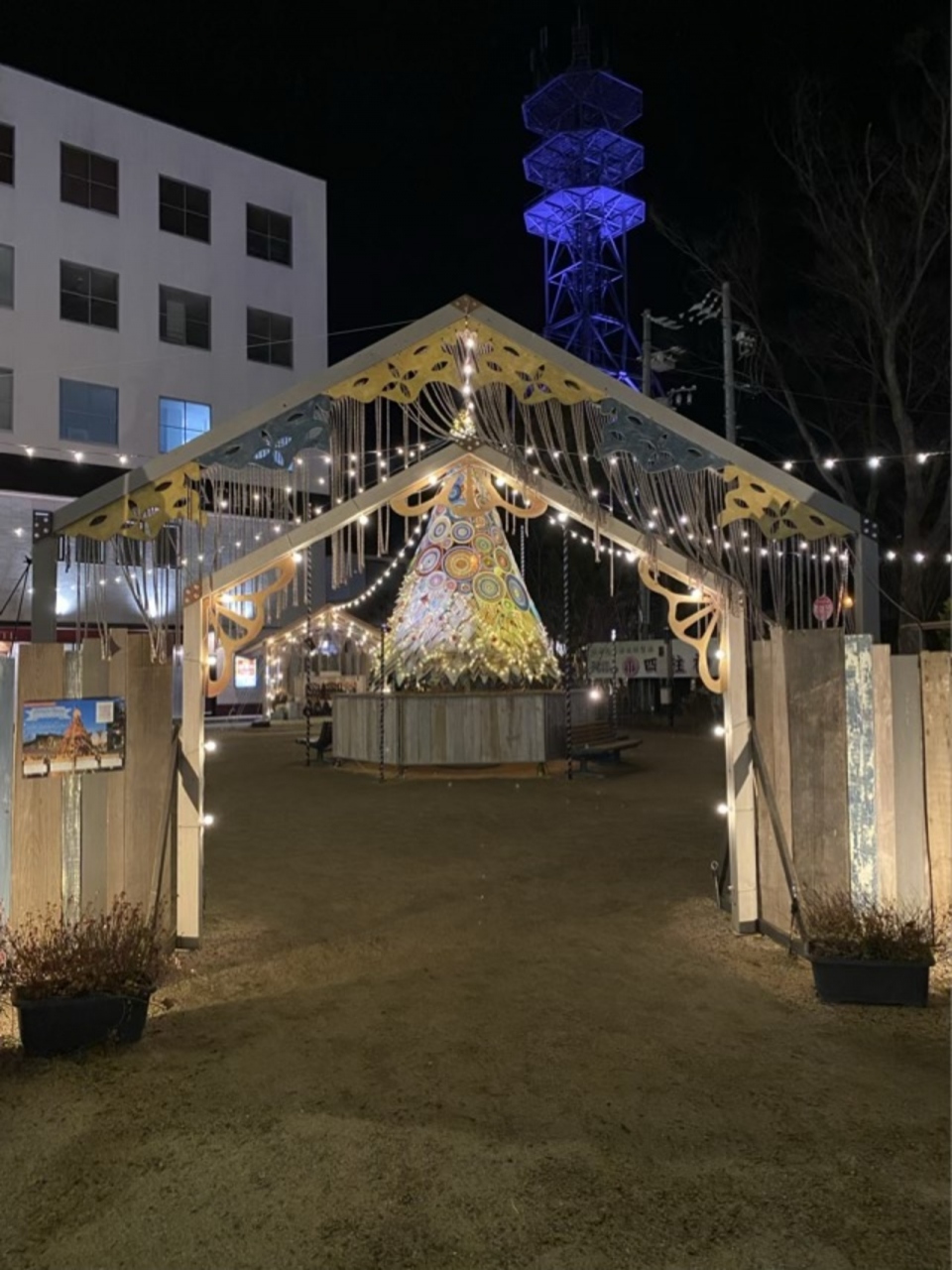 松本駅から松本城を目指して本町通りを進んで千歳橋を渡ると本町通りは右に少しずれて大名町通りと名前を変えます。このくいちがっている所に大手門の枡形があったのですね。大手門の遺構などは見られませんが名前として残してくれているだけでも当時の光景を想像することができてありがたいです。夜に訪れると唐傘のお化けみたいなツリーがイルミネーションされていました。