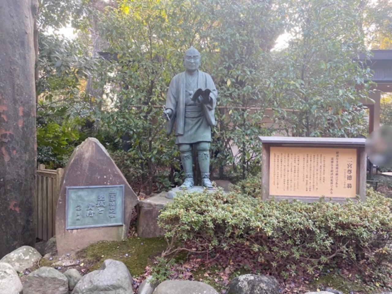報徳二宮神社の境内にありました。最初に見つけたのはお馴染みの薪を背負って本を読みながら歩いている少年時代の像ですがお爺さん時代の像があってこちらのタイプは初めて見ましたね。「経済なき道徳は虚言であり道徳なき経済は犯罪である」とありますが頷けるお言葉ですね。