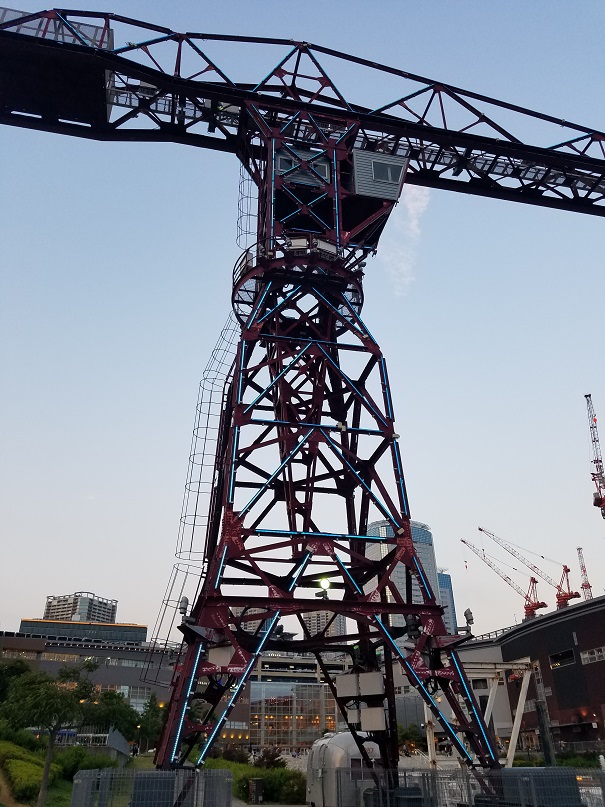 このクレーンが夕暮れとともにイルミネーションされだしてじっと見ているとグリーンや青、赤と色がさまざまに変わっていって暫く見ていても飽きませんでした。