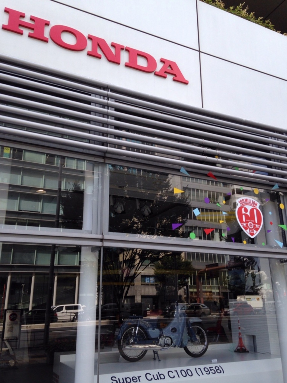 青山一丁目の交差点で信号待ちしていると懐かしいバイクが展示されているのに気がつきました。1958年の登場から60周年を迎えたスーパーカブですね。