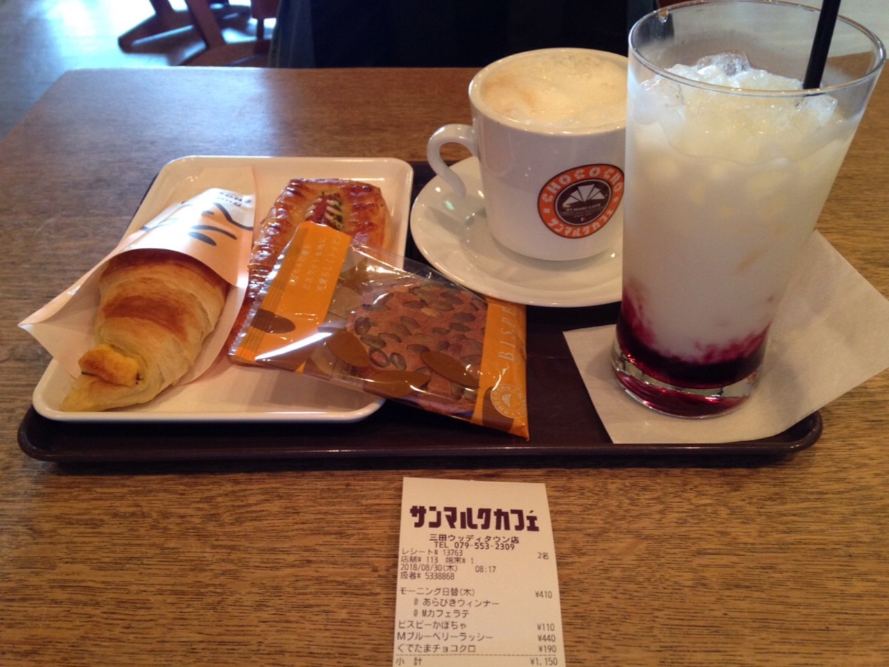 ラテに加えてブルーベリーラッシーというのが気になったので購入。メニューの写真ではもっと紫色でしたが自分で搔きまぜるとだんだんそれに近づきました。- 旅行時期
