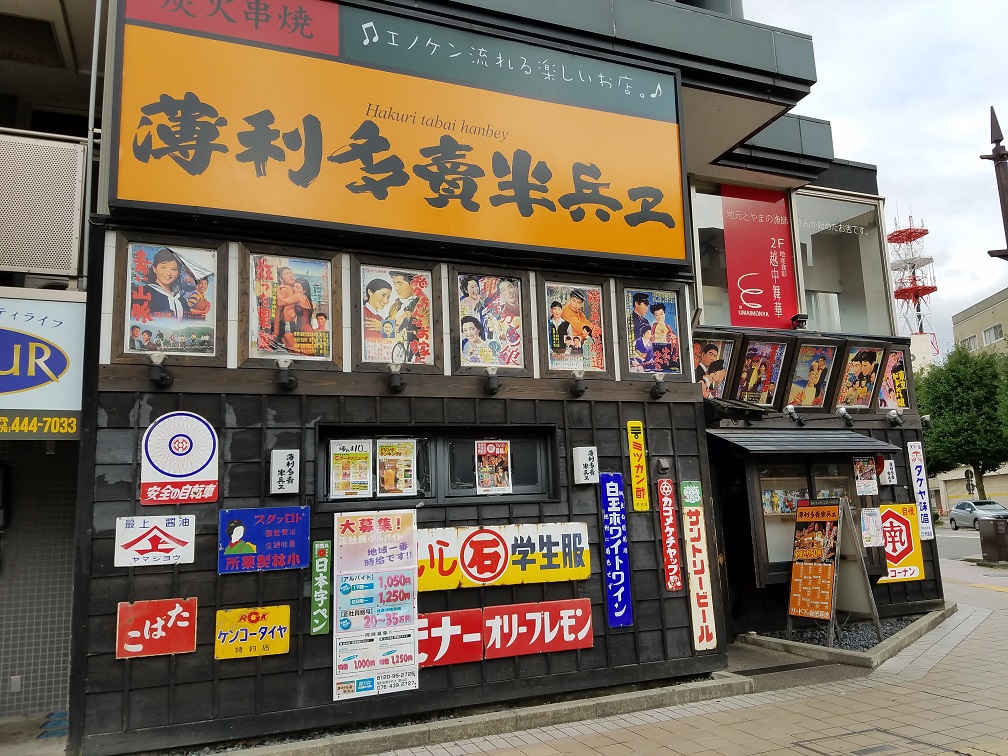 外観は昭和の映画ポスターやブリキの看板がベタベタ掲げられていて最初は何のお店か分かりませんでしたが、炭火串焼きの飲み屋さんでした。