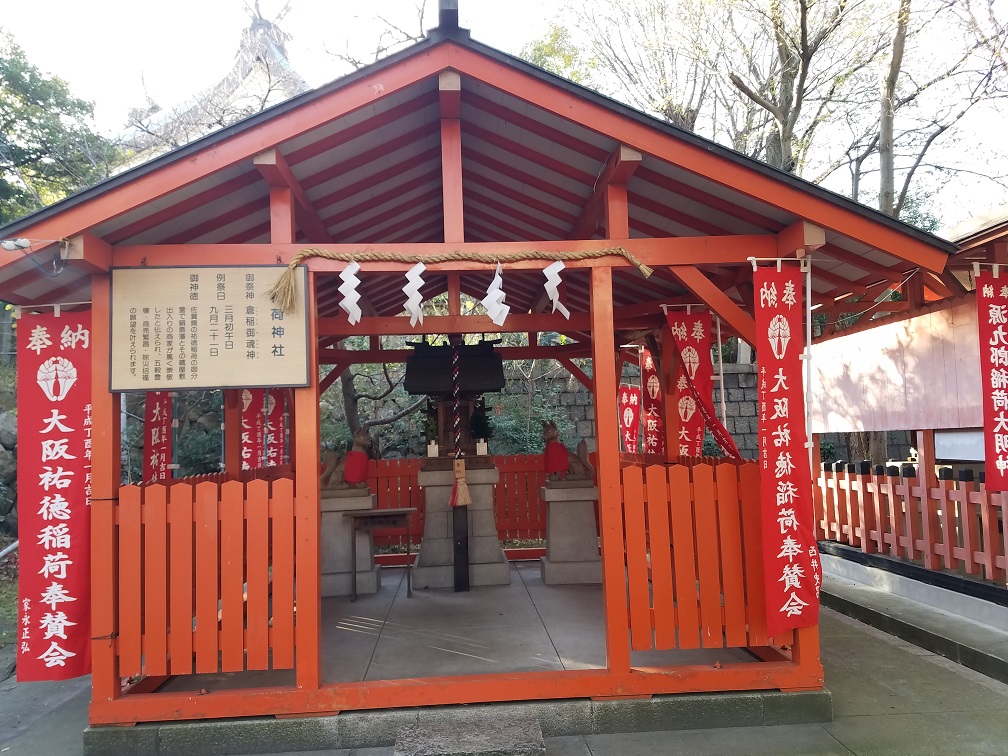 生國魂神社の末社の一つですが随分平凡な名前だなと思ったら説明板に祐徳稲荷神社からの分霊とあり、いつかは行きたいと思っていた佐賀の名神社が清水の舞台みたいな高台の上に建つ光景が一気に頭を巡りました。