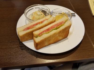 本日のサンドイッチランチみたいのにするとトマトとサーモンのサンドとミニサラダにゼリーが付いてきました。