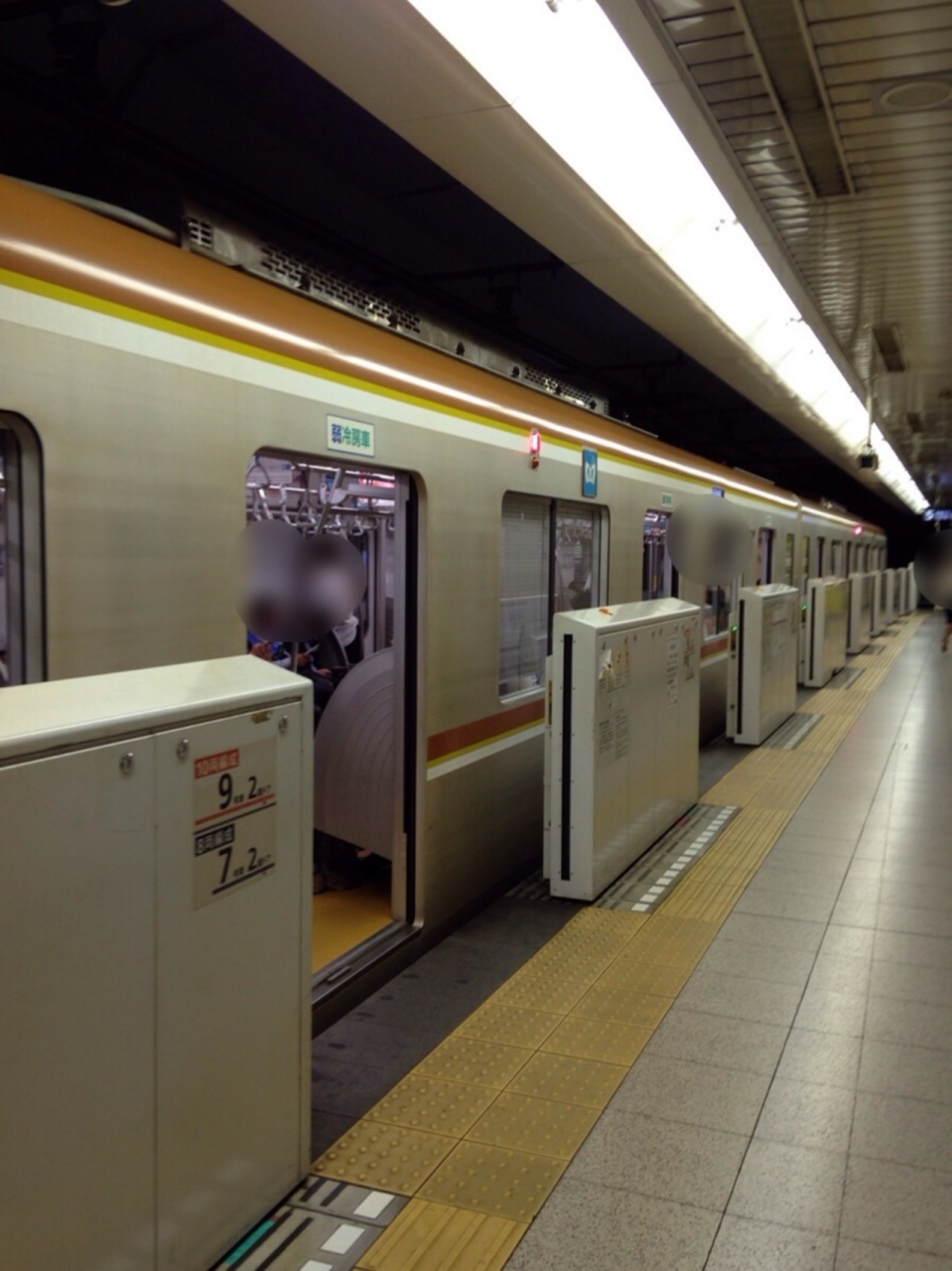 東急東横線と乗り入れているので銀色に青や銀色に赤とかいろんな色の列車が来るのですが本来の副都心線は写真のように茶色と黄色のアクセントが入ったやつのようです。駅の案内板の色も茶色ですし。