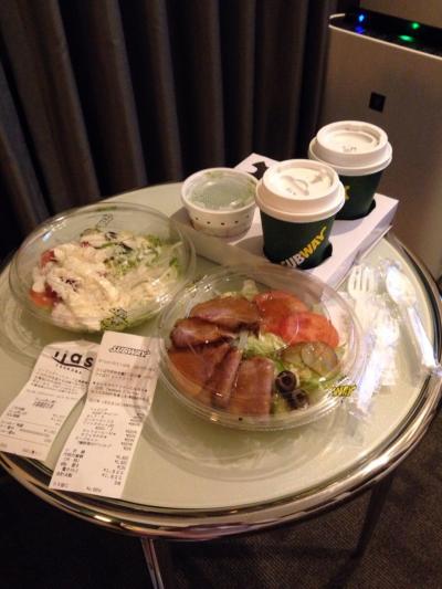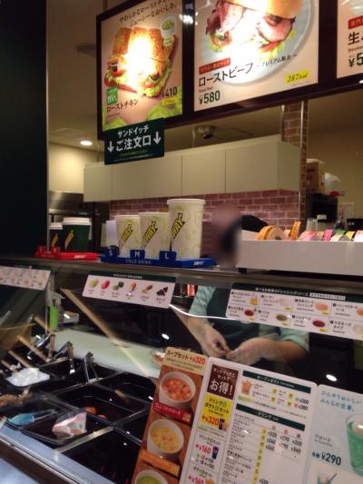 フードコードは広くてテーブルはたくさん空いていましたがホテルでテレビ観たかったので緑のスープとコーヒーとカフェラテと共にテイクアウト。