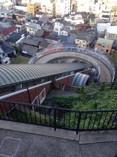 長崎の坂に合わせて斜めに上下するエレベータです。