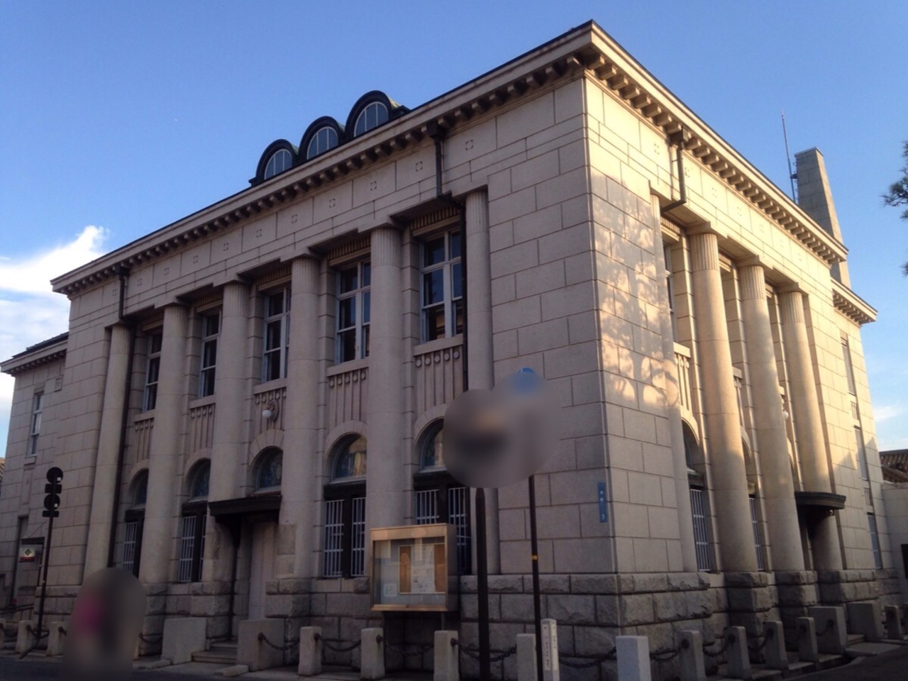 大正11年に建てられたルネサンス風の建物で正面と側面の円柱が圧倒的な存在感ですが3つの屋根窓もかわいいです。