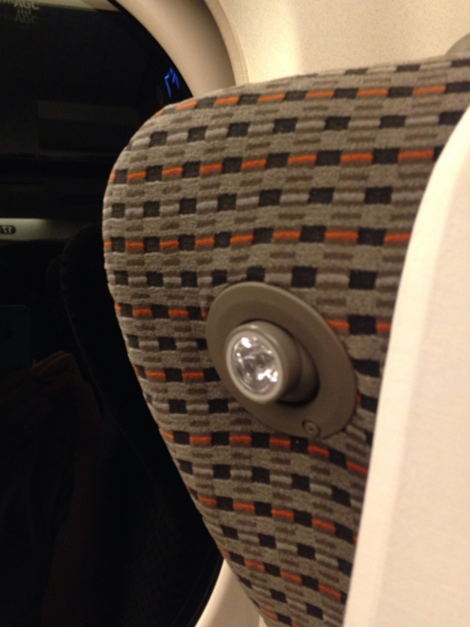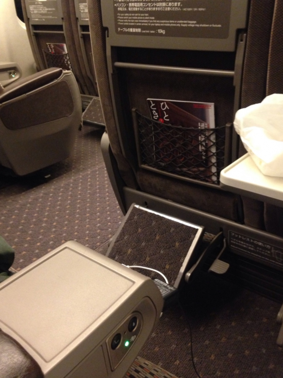設備はフットレスト、全席に電源、椅子の頭の横に読書灯、足下の温風、前席背面のテーブルに加えて肘掛けに補助テーブルなどです。車両端あたりの頭上荷物置きには毛布がいくつかありました。