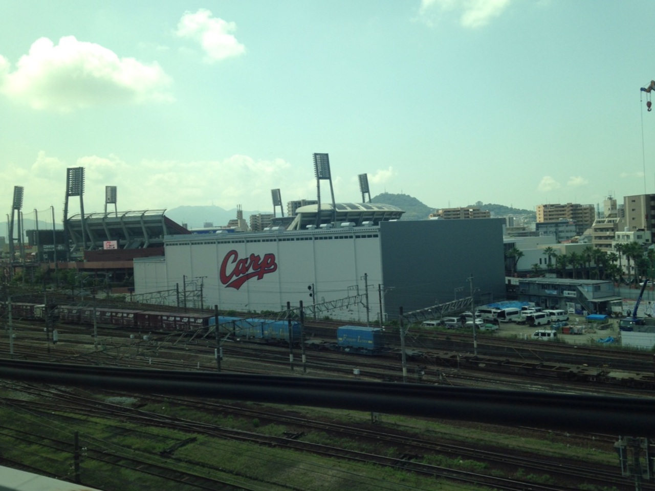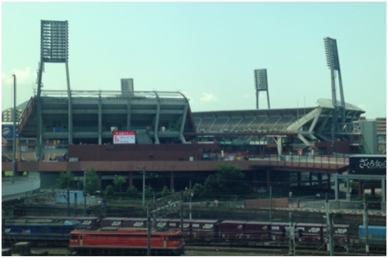 外野席の一部が切り取られたような外観ですがこれは新幹線の車窓から球場内を見られるように意図したものだそうです