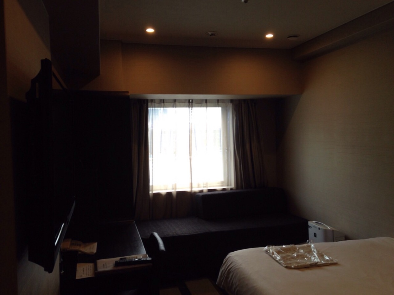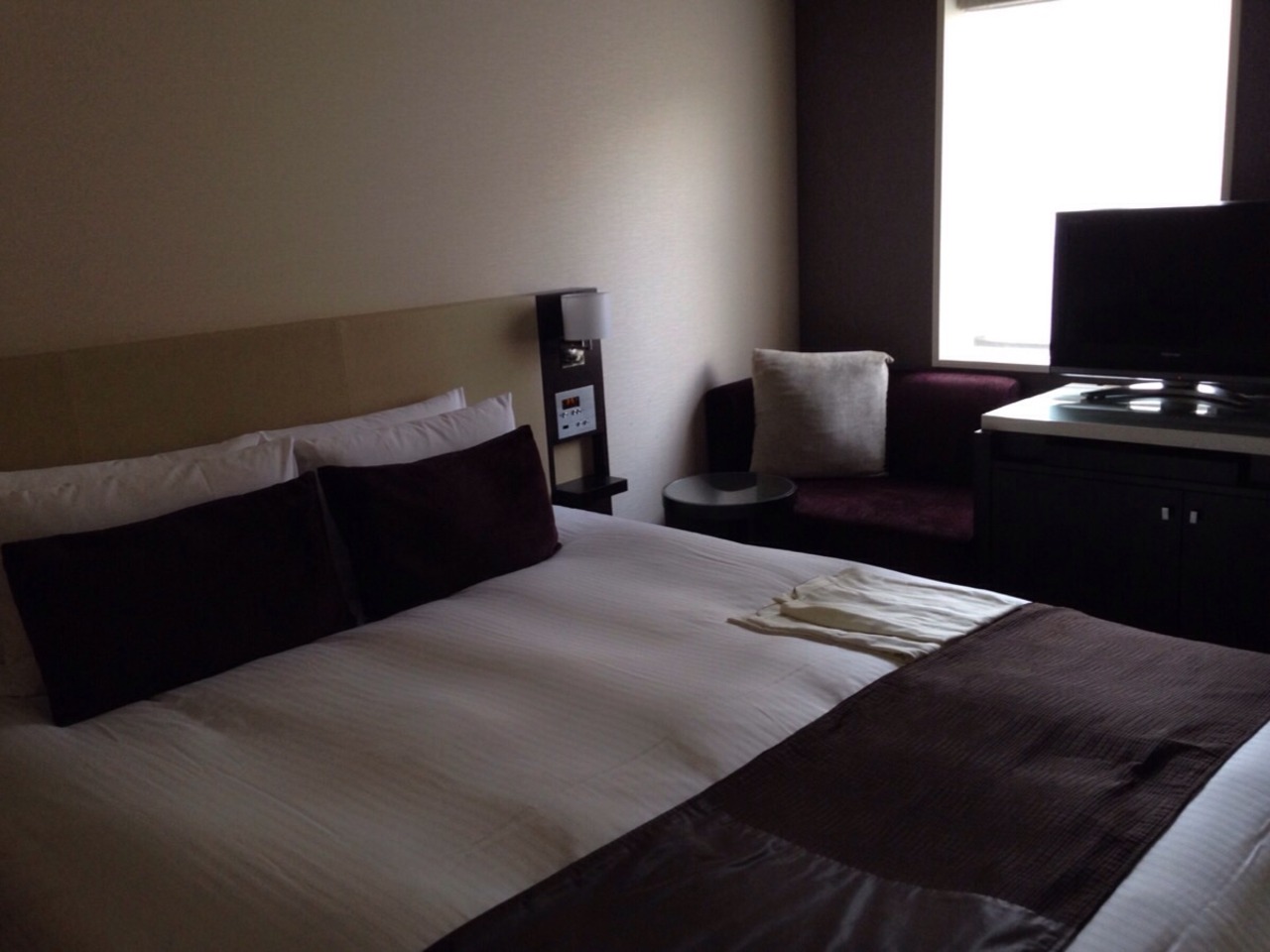 ダブルの部屋でベッドが大きいのは良いのですがその分ベッド周りのスペースが狭くてちょっと窮屈でした。