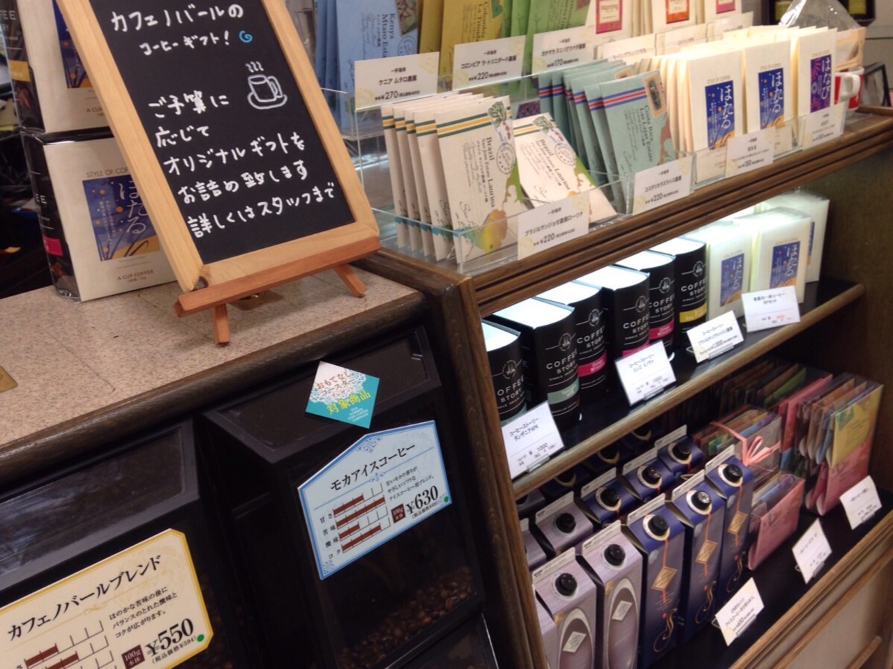 ホテルでゆっくり飲む用にドリップコーヒーみたいのが欲しかったのですが、なかなか意図が通じずにポットみたいのを勧められたりしましたが入り口付近にある棚をじっくり見ていたら箱入りのとバラ売りのシングルサーブというのがあったので無事にゲットできました。