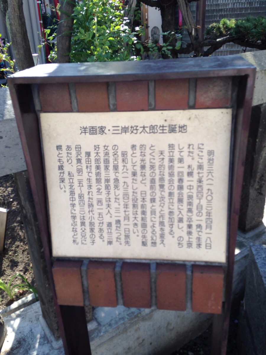 すすきのの豊川稲荷札幌別院の前に看板があったので読んでみると明治生まれの洋画家、三岸好太郎(みぎしこうたろう)の生誕地とのこと。