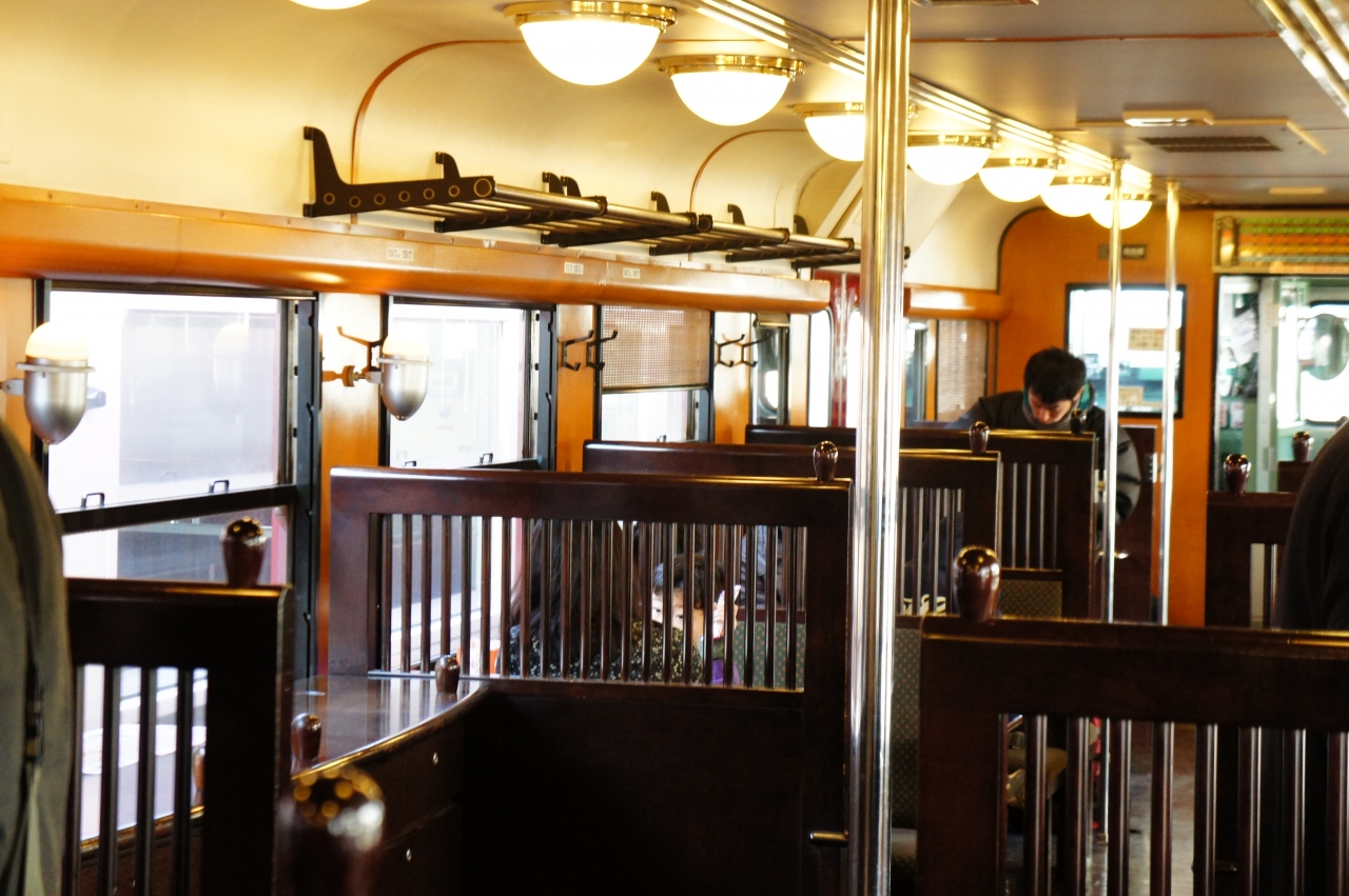 【車両】木のぬくもりあふれるデザインです。車内は4人掛けボックスシートが基本ですが,一部2人掛けシートがあります。座席は固定式です。車両中央には展望スペースがあり,自由に使用できます。
