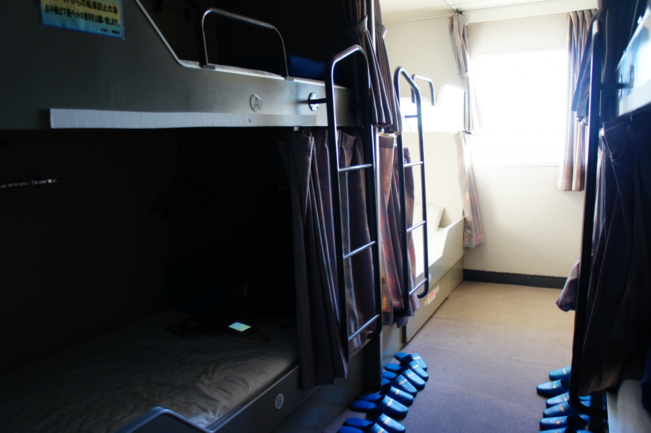 【船室】「二等指定B洋室」を使用しました。二段ベッドが4つあり,8人部屋でした。今回は繁忙期でしたが,3名のご家族連れの方と相部屋となり,計4名で使うことになりました。ベッドにはカーテンがついているので特段気になることはありませんでした。入口付近に,荷物棚と洗面台がありました。