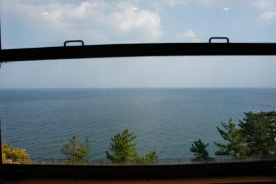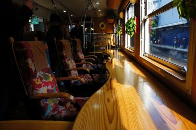 【車両】車内は木をふんだんに使ったやさしいデザインです。海側の座席のほとんどが,窓側を向いているので,錦江湾の絶景が楽しめます。山側の座席はふつうの2人掛けシートです。自由に座れるソファ席もありました。
