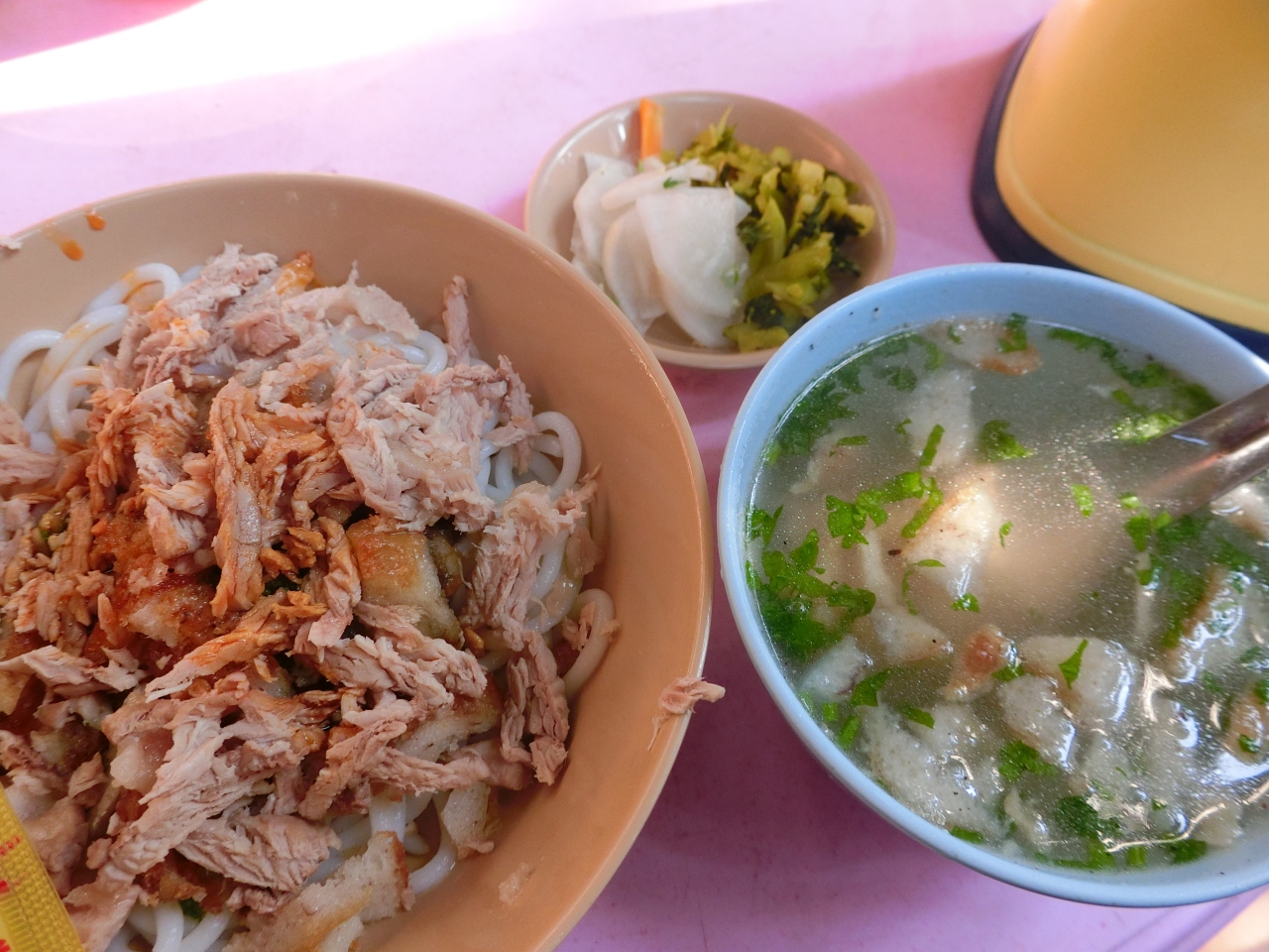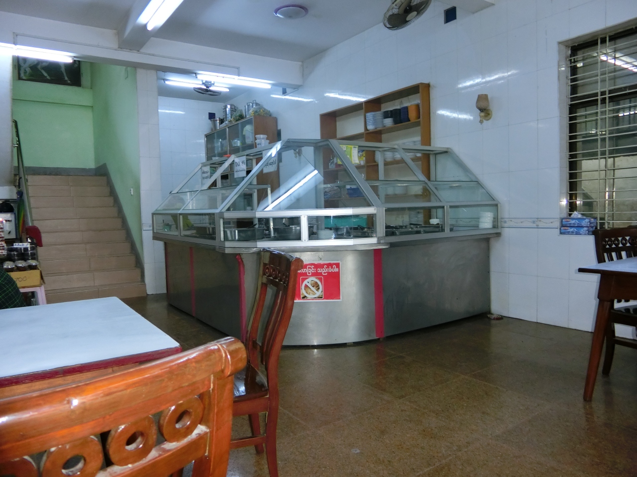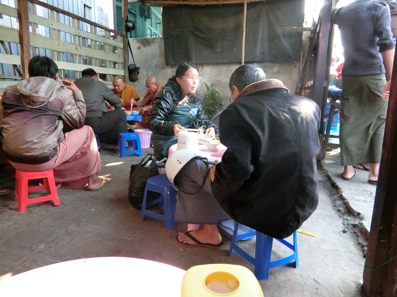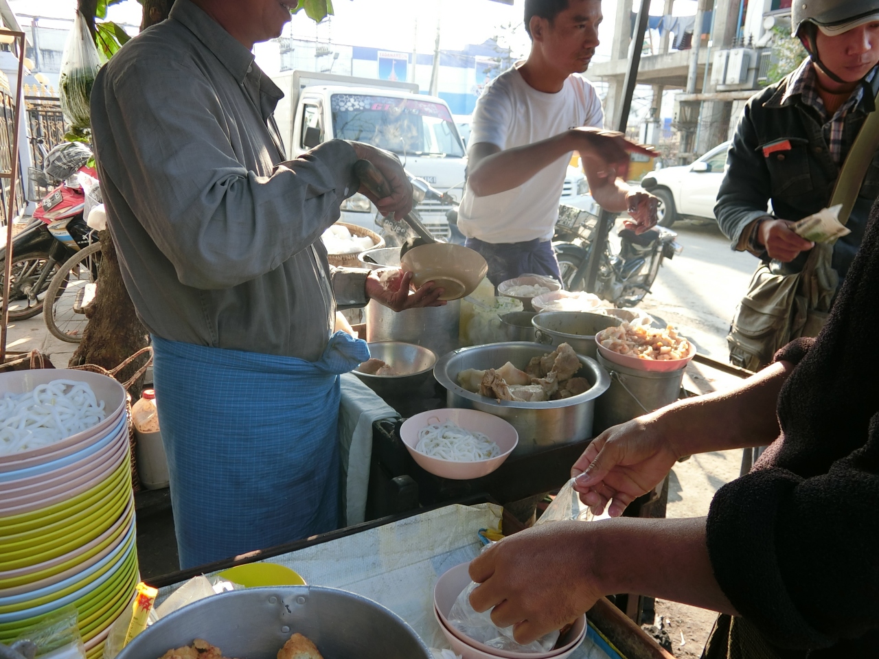 マンダレー名物の麺料理・ミシが食べられる屋台です。人気のお店なので、探してウロウロしていたら、地元の方に「バトゥ―?」と聞かれて、教えていただきました。ミシはたれをからめて食べる汁無し麺で、モヒンガーやオンノカウスエなどと比べるとあっさりしています。辛味がピリッと食べやすく、朝食にぴったりでした(ちなみに、私は辛いもの大好き派です)。スープとお漬物が付いてきます。1日の分が売切れると終わってしまうようなので、早めに行った方が良いかもしれません。