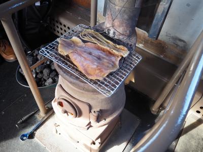 スルメは、アテンドの方がストーブの上で焼いて、裂いて、袋に入れて下さいます。