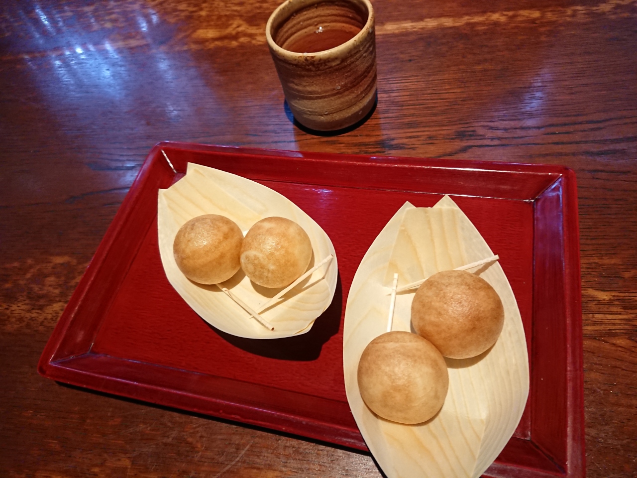 たこ焼きのような外観で、小さな経木の舟に乗ってくる、つぶら餅をいただきました。